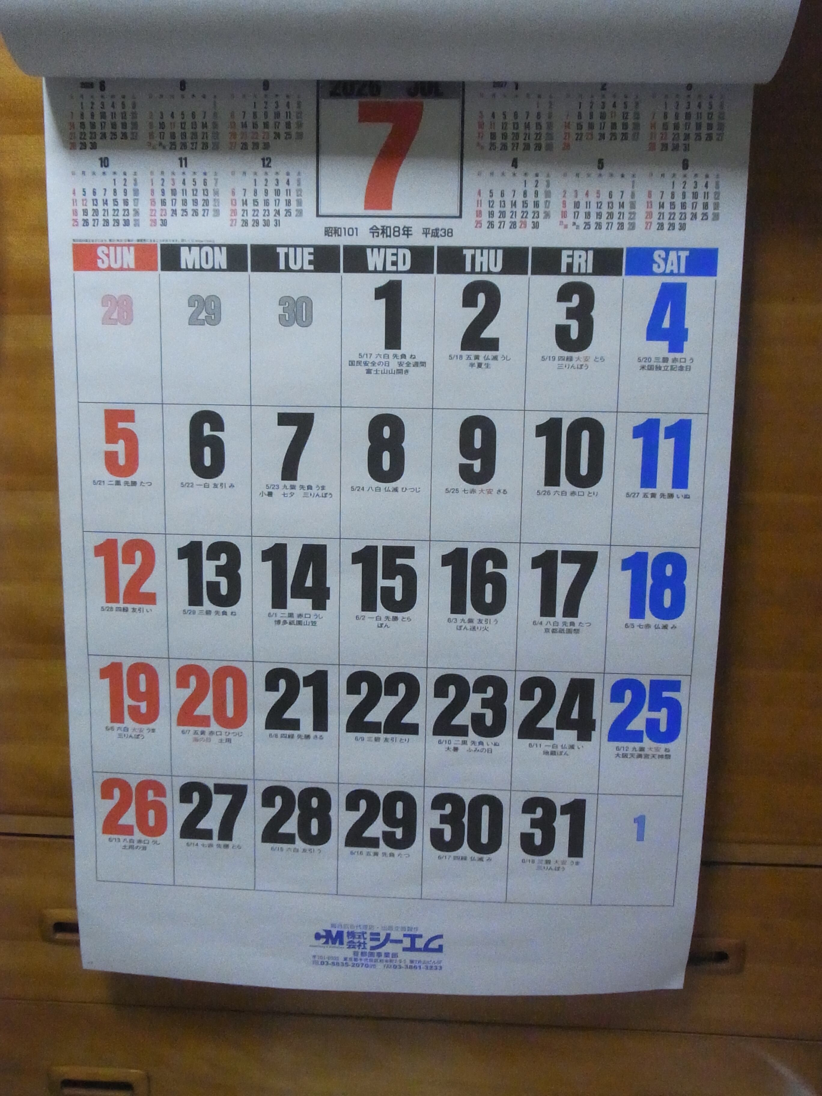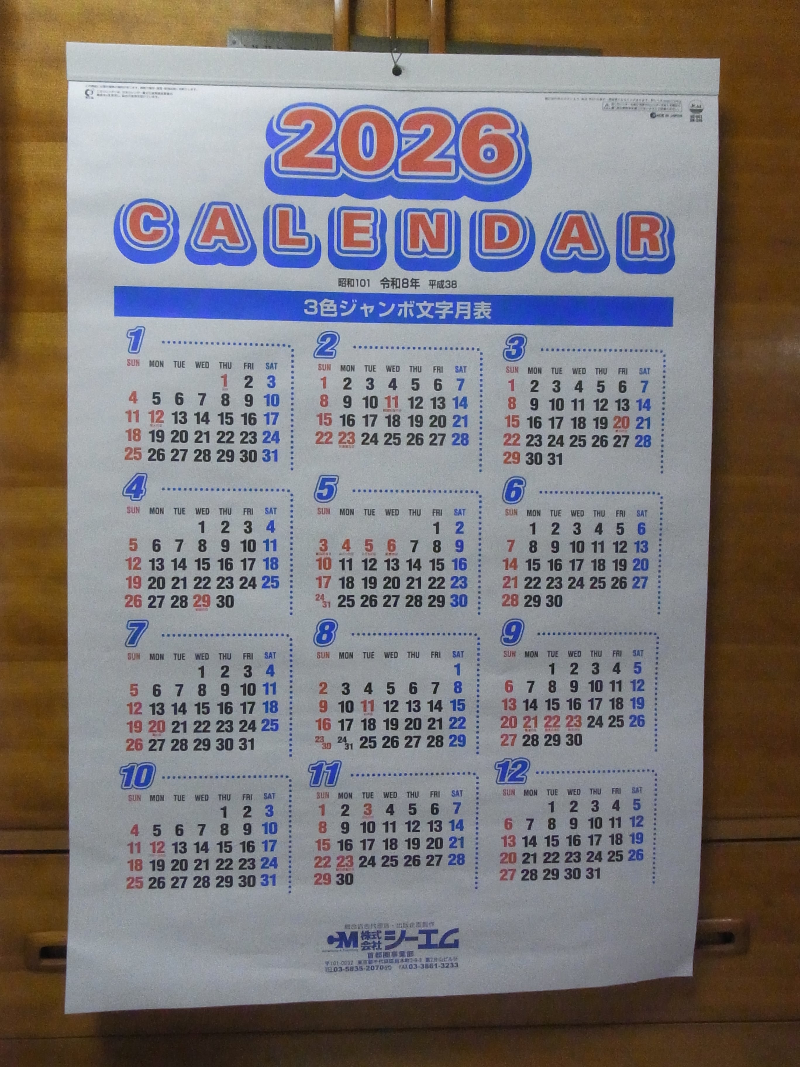 ・2026年 令和8年 カレンダー 3色ジャンボ文字 壁掛け です。