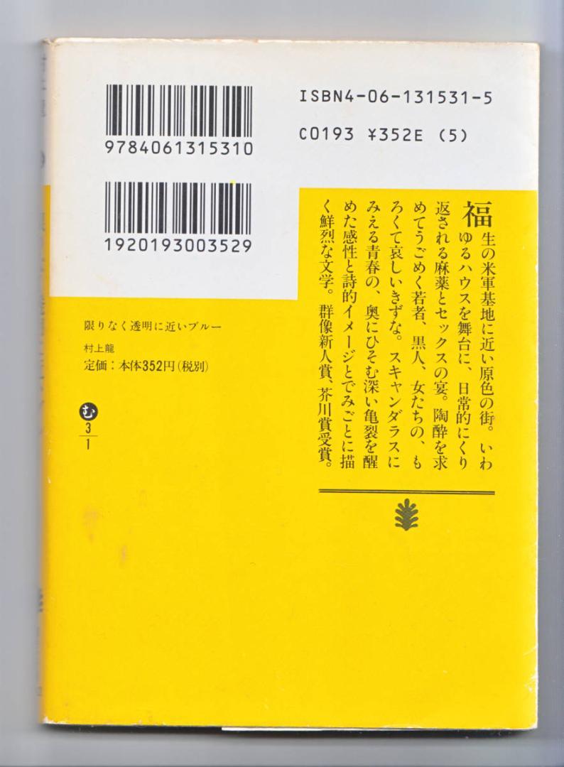 小説 文庫本 限りなく透明に近いブルー 村上 龍 著