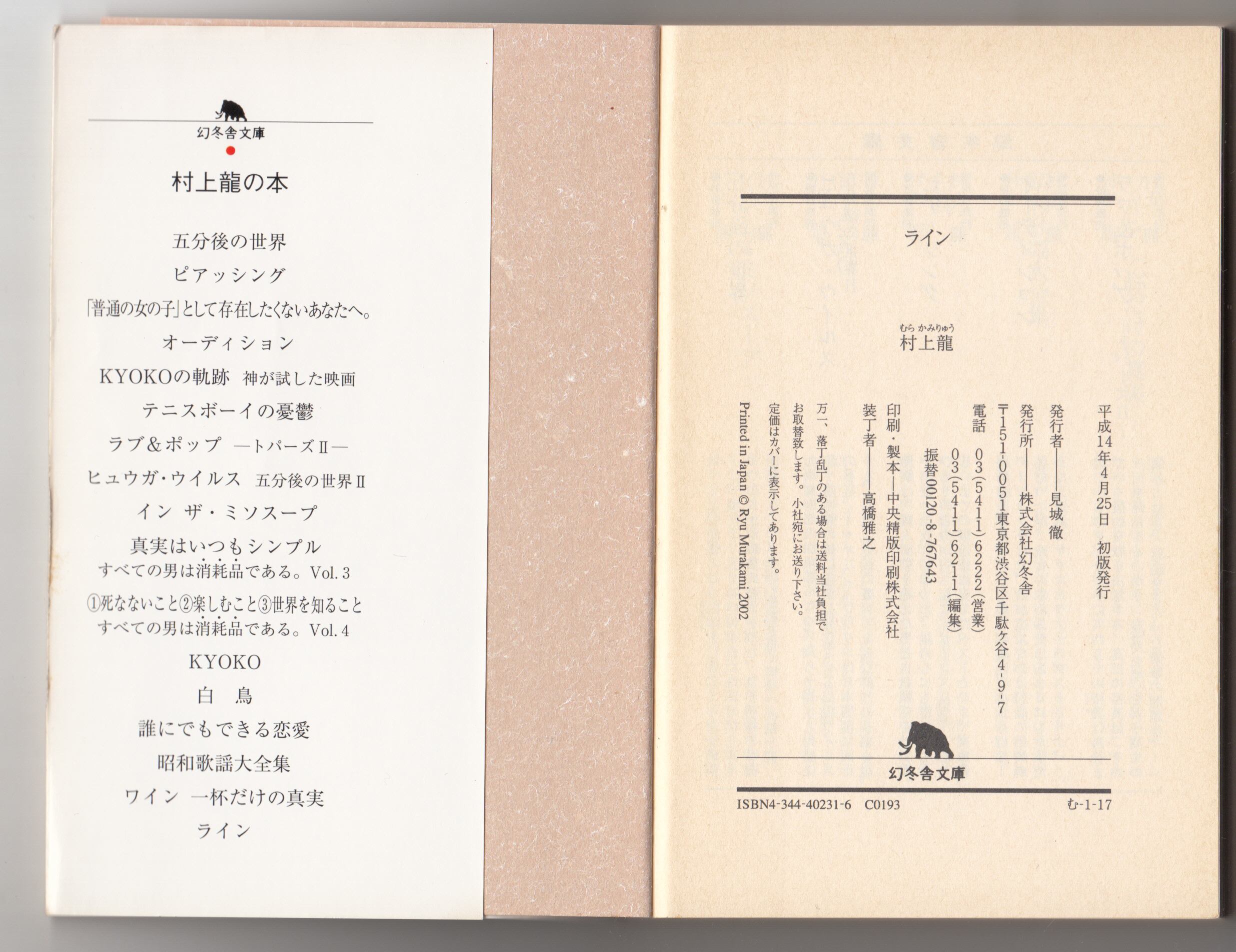 小説 文庫本 ライン 村上 龍 著