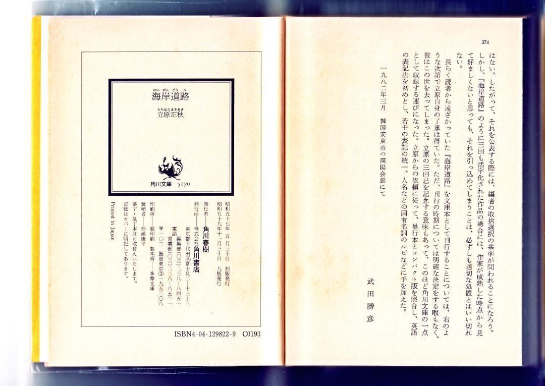 小説 文庫本 海岸道路 立原 正秋 著